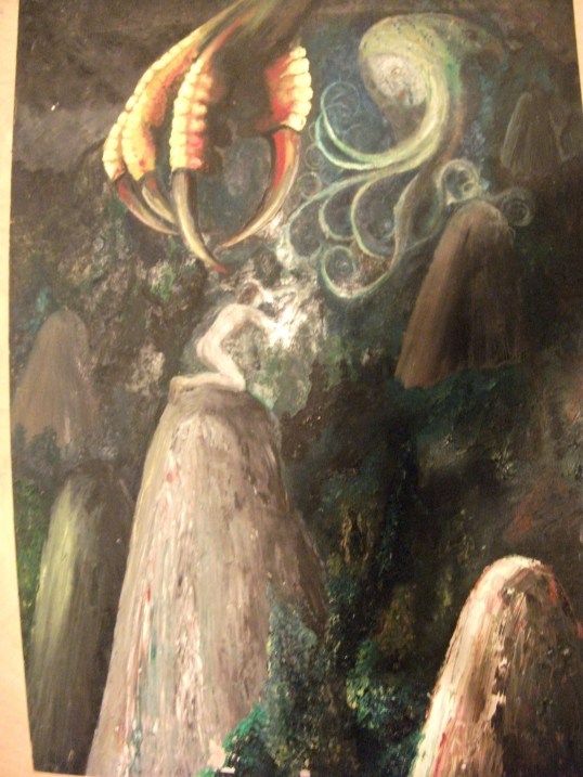Lately I have been trying to clear things out of the house to make some space. I still have my large art folder containing the artwork I did at school thirty years ago! I can’t keep such things for ever but there are a few pictures I might hang on to. I will throw out my paints though – they can’t be much good after all this time! I decided to take photos of the best few pictures and post them on this blog. Then, if I decide to chuck the lot out there is still a record. I never improved on my school work, and the photographed images somehow look better than the real things – and I like to see pictures on the blog.